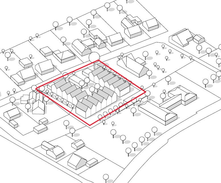 Geplant sind hier 17 Reihenhäuser, von denen fünf als freifinanzierte Mietangebote realisiert werden. Die übrigen 12 Reihenhäuser werden mit öffentlichen Mitteln errichtet. Alle Häuser werden im eigenen Bestand gehalten.