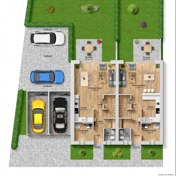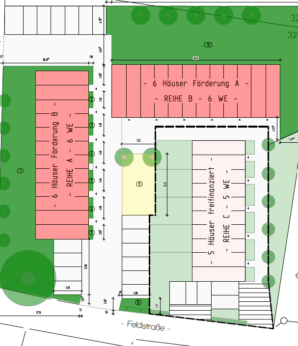 Die 12 Reihenhäuser sind in A- und B-Förderung aufgeteilt. Es werden jeweils 6 Stück in A-Förderung und 6 in B-Förderung gebaut.